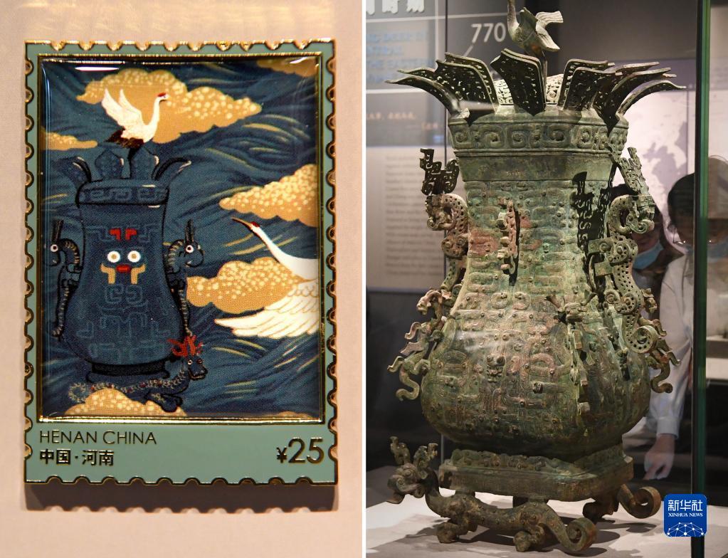 拼版照片:左圖為河南博物院推出的“蓮鶴方壺”冰箱貼;右圖為河南博物院展出的展品“蓮鶴方壺”(5月17日攝)。