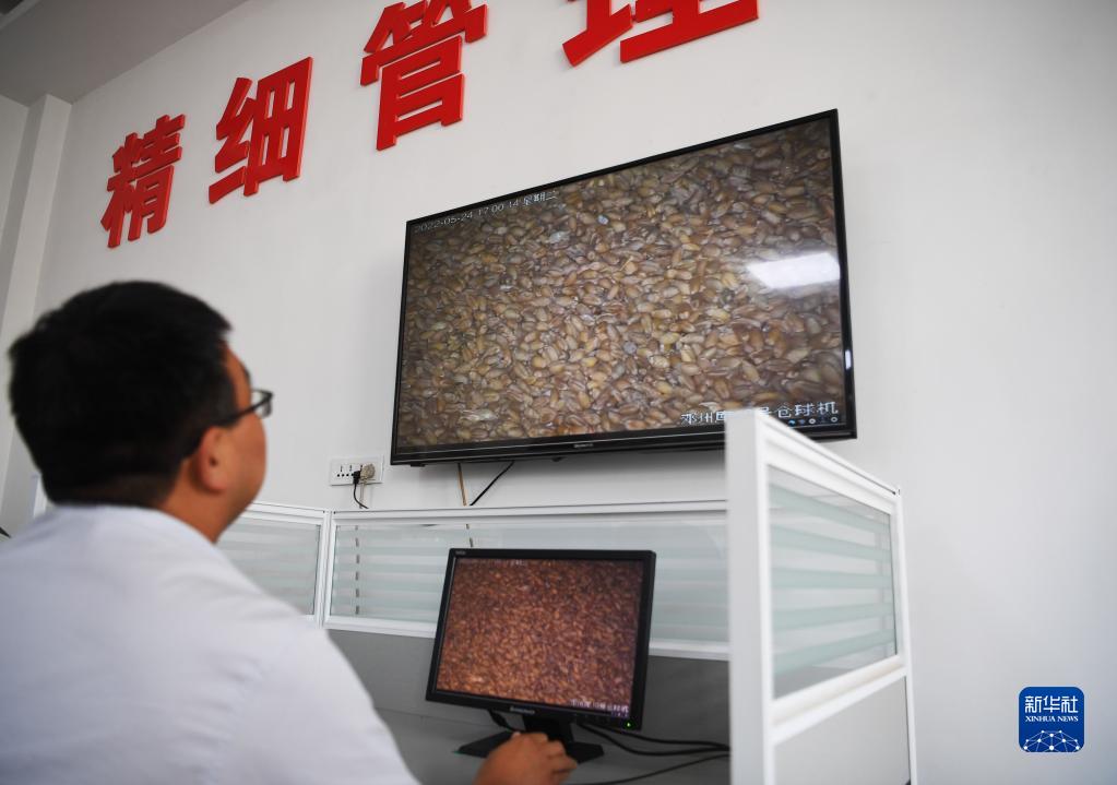 5月24日,在中央儲備糧鄧州直屬庫有限公司內,工作人員通過(guò)智能化糧庫集成控制平臺監測小麥存儲情況。