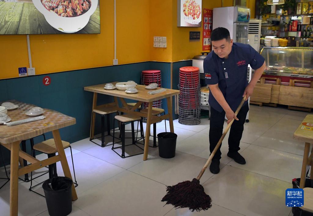 張占領(lǐng)在位于鄭州市二七區的店鋪內打掃衛生(5月31日攝)。