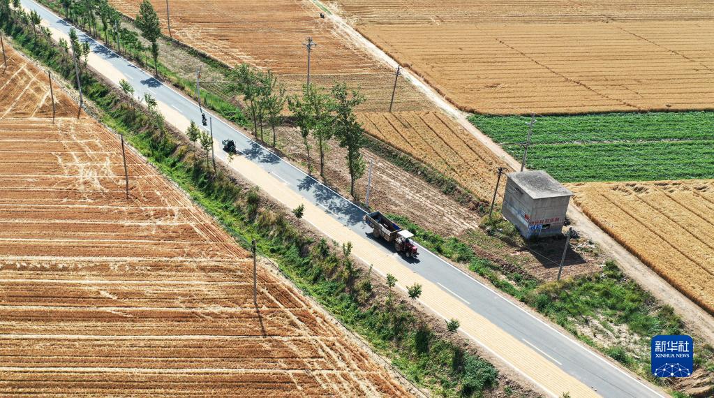 6月7日,劉建儒開(kāi)著(zhù)拖拉機準備到地里裝新麥(無(wú)人機照片)。