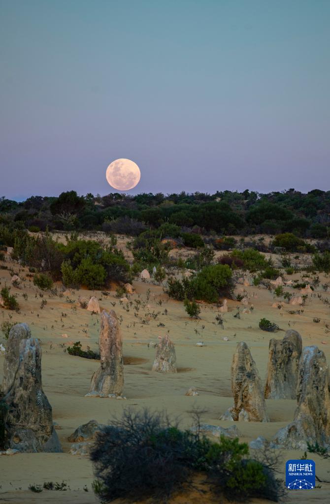 這是6月14日在位于澳大利亞西澳大利亞州的尖峰石陣拍攝的“超級月亮”。