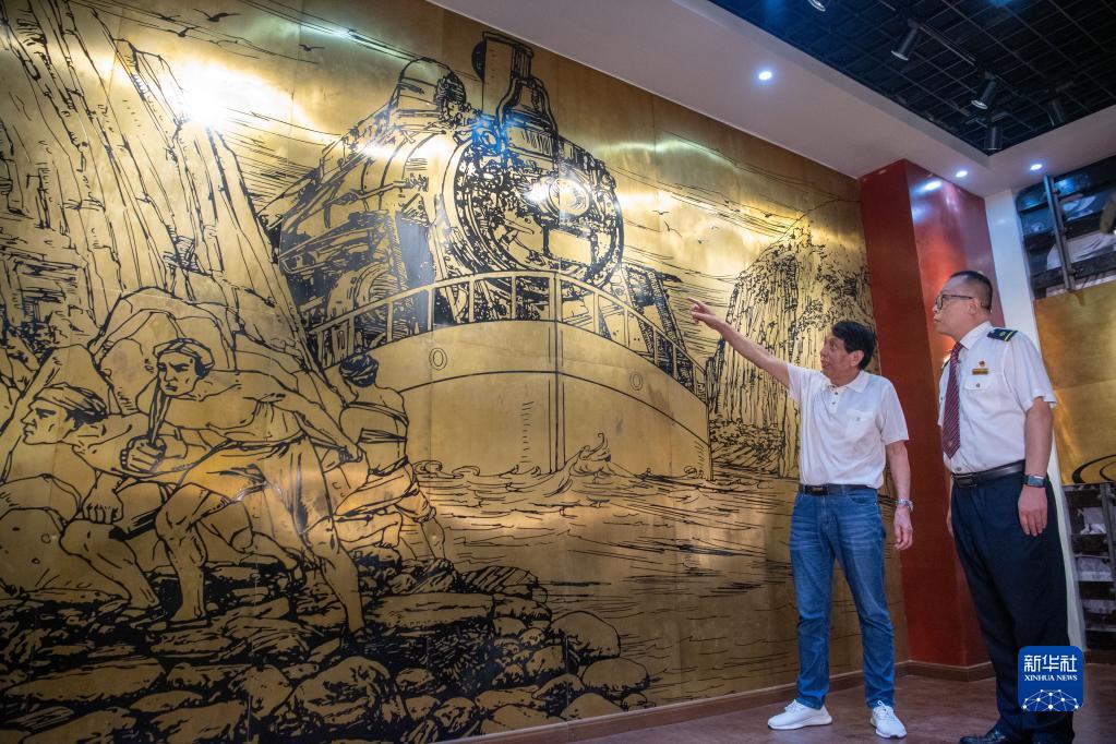 6月29日,在重慶機務(wù)段榮譽(yù)陳列室,李治剛(右)與父親李國方在一幅畫(huà)作前回憶爺爺李鴻升講述的成渝鐵路通車(chē)時(shí)的故事。