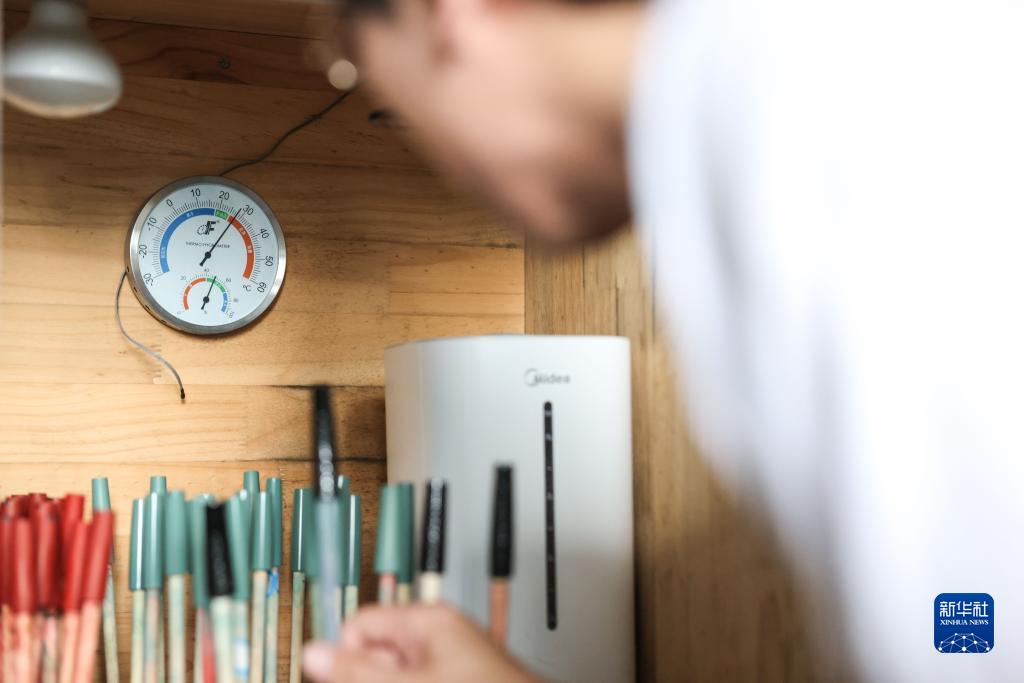 7月1日,袁建在位于貴州大學(xué)國家大學(xué)科技園內的工作室查看鋼筆配件半成品的儲存濕度。
