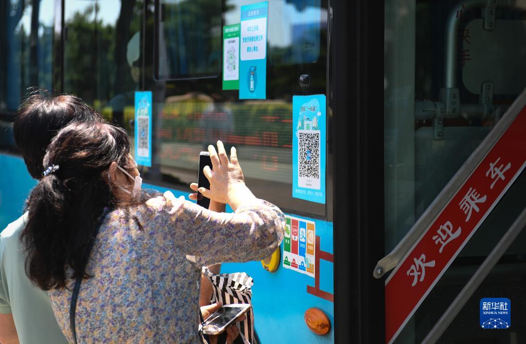 7月6日,乘客在西安市鐘樓附近一公交站掃碼乘車(chē)。