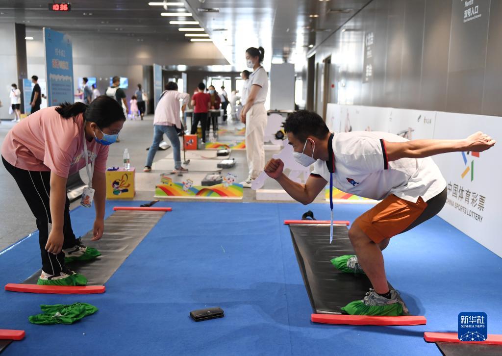 7月16日,工作人員在演示速滑訓練板的使用方法。