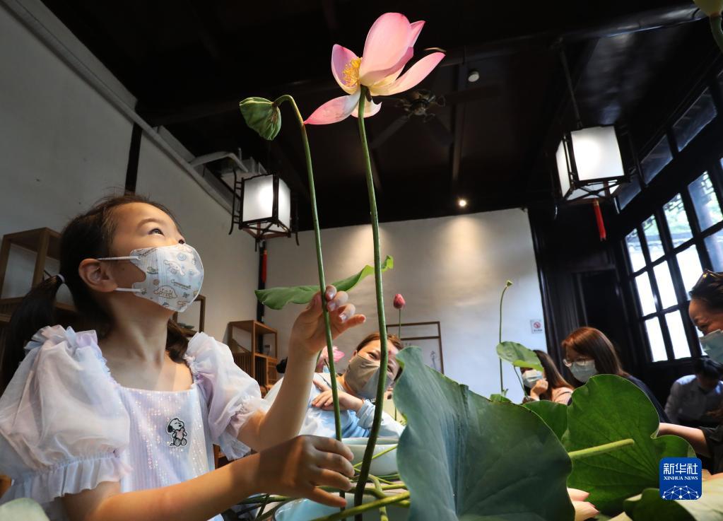 7月17日,在江蘇蘇州古典園林拙政園,一名小朋友在家長(cháng)陪同下體驗夏荷插花。