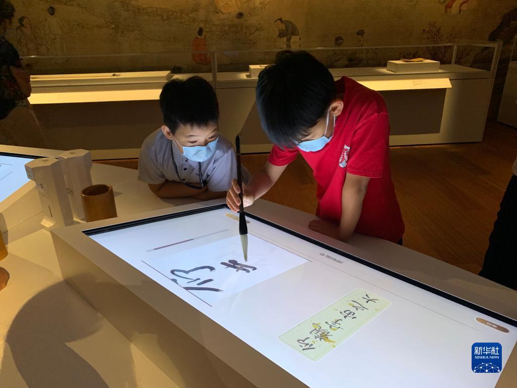 7月13日,在香港故宮文化博物館互動(dòng)體驗區,小朋友體驗毛筆書(shū)法臨摹項目。新華社記者 黃茜恬 攝