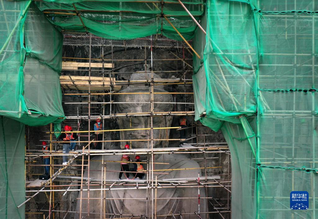 工作人員在洛陽(yáng)龍門(mén)石窟奉先寺進(jìn)行病害調查評估(4月14日攝,無(wú)人機照片)。 新華社記者 李安 攝