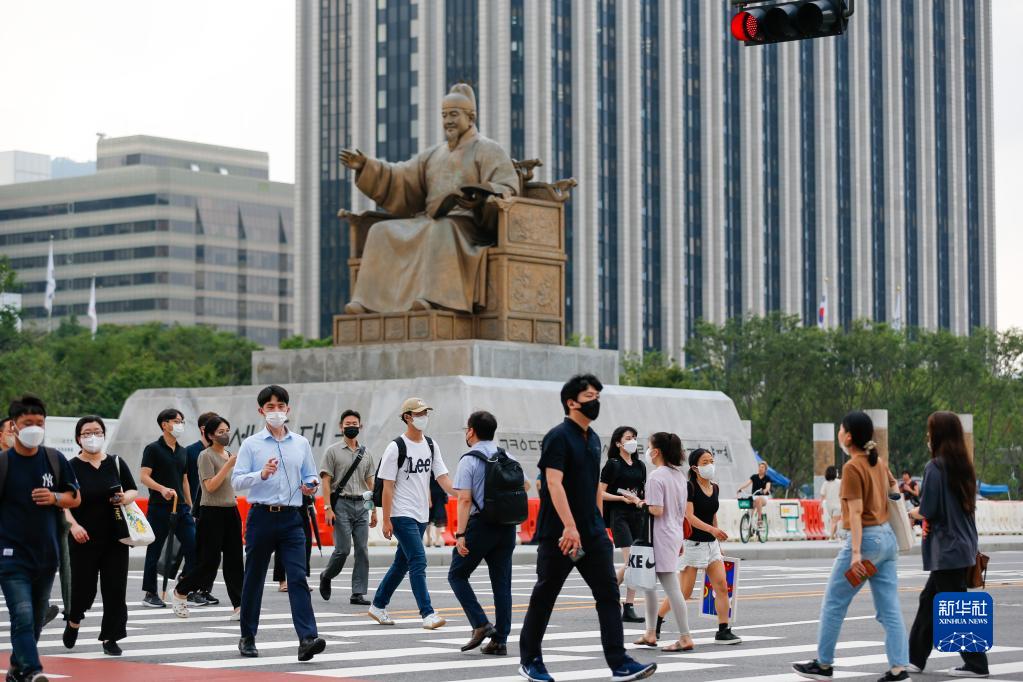 8月3日,行人佩戴口罩在韓國首爾光化門(mén)廣場(chǎng)過(guò)馬路。