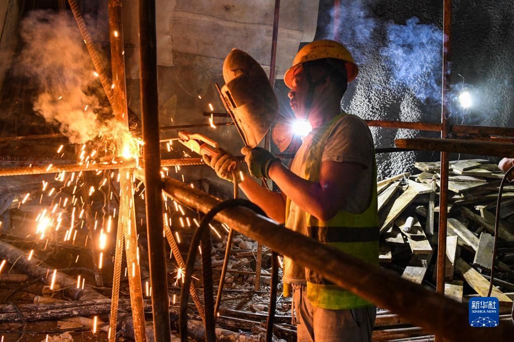 8月3日,在位于廣西環(huán)江毛南族自治縣的貴南高鐵大方山隧道內,工人在焊接鋼構件。