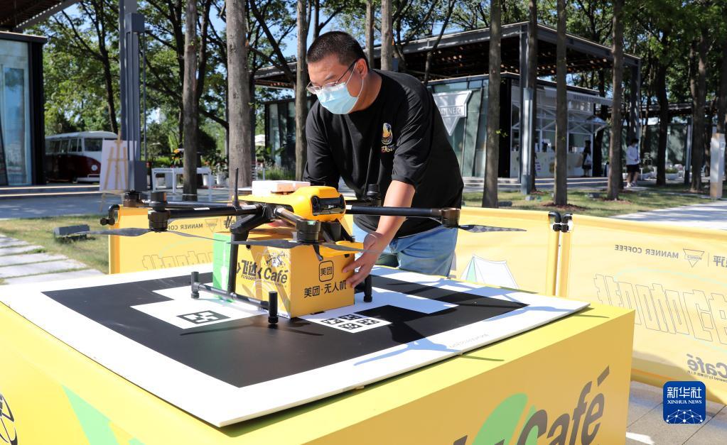 8月4日,工作人員將裝有咖啡的紙箱安放在位于無(wú)人機下方的貨架上。