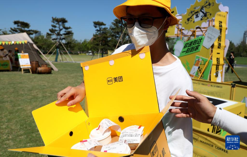 8月4日,工作人員在上海世博文化公園露營(yíng)區展示無(wú)人機送來(lái)的咖啡。