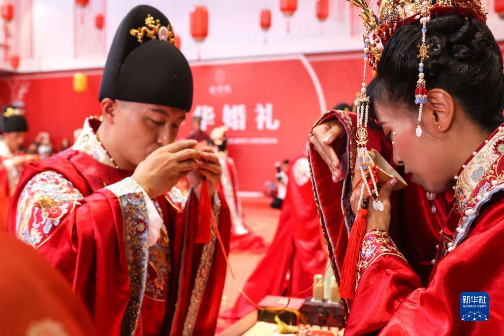 8月4日,新人在婚禮儀式上行合巹禮。