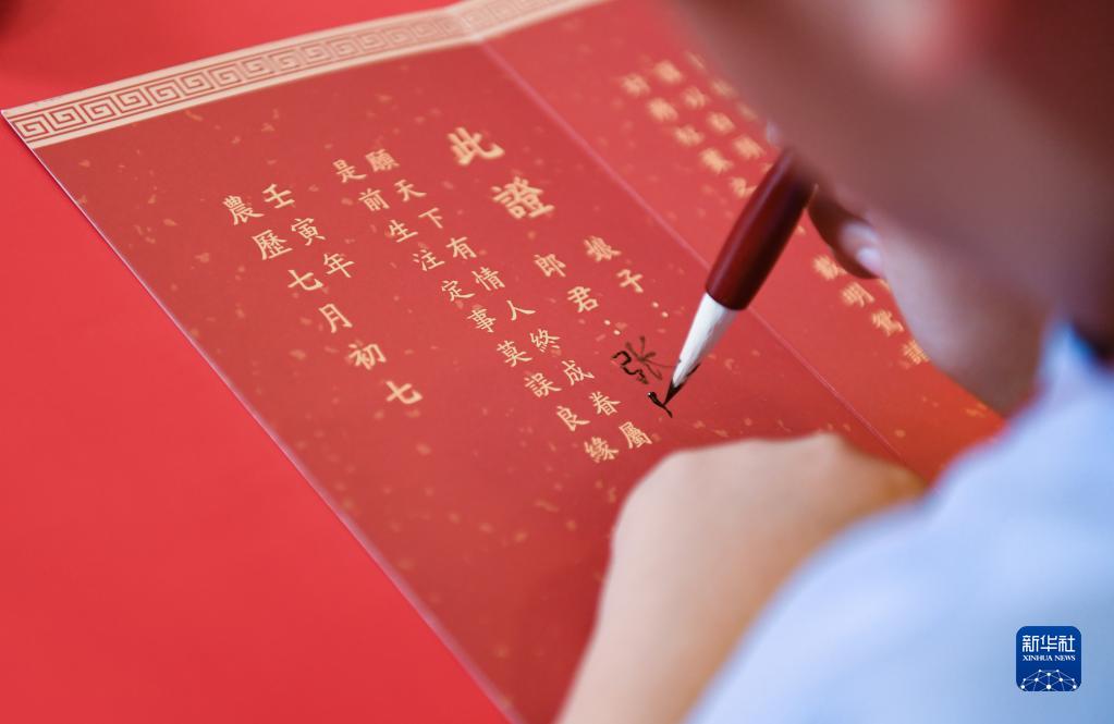 8月4日,游客在“長(cháng)安十二時(shí)辰”主題街區體驗寫(xiě)“婚書(shū)”。