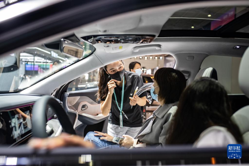 8月4日,工作人員(左一)在第23屆中國(昆明)國際汽車(chē)博覽會(huì )上向參觀(guān)者介紹展車(chē)。