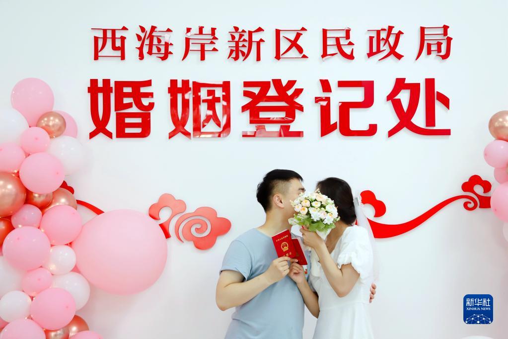 8月4日,在山東省青島市西海岸新區民政局婚姻登記處,一對新人領(lǐng)取結婚證后拍照留念。