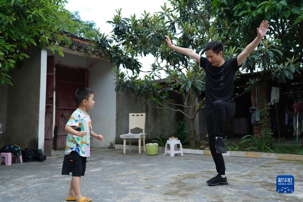 在四川省什邡市馬井鎮同心村,王忠禮和兒子在院中玩耍(8月2日攝)。