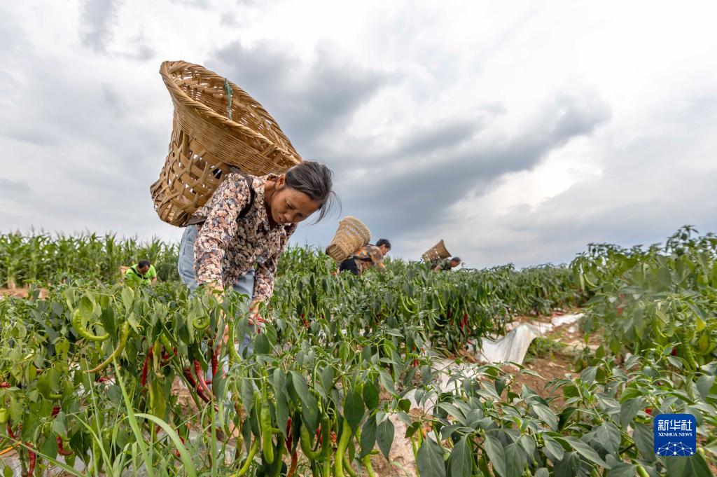 8月5日,村民在貴州省黔西市林泉鎮合心村采收辣椒。