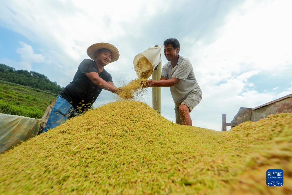 8月5日,村民在貴州省黔東南苗族侗族自治州岑鞏縣水尾鎮新場(chǎng)村收割制種水稻。