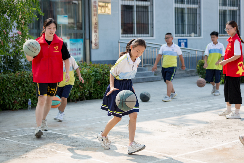 河南省安陽(yáng)市安陽(yáng)縣韓陵鎮新時(shí)代文明實(shí)踐所,韓陵鎮東梁貢小學(xué)四年級學(xué)生郜雨婷(左二)在文藝志愿者的指導下進(jìn)行籃球訓練。