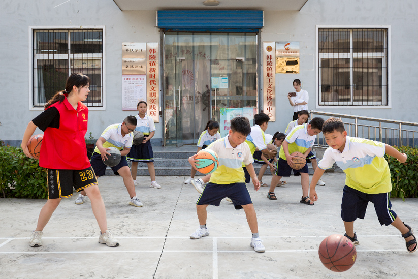8月2日,河南省安陽(yáng)市安陽(yáng)縣韓陵鎮新時(shí)代文明實(shí)踐所,韓陵鎮東梁貢小學(xué)四年級學(xué)生在文藝志愿者的指導下進(jìn)行籃球訓練。新華網(wǎng)發(fā)(王建安 攝)