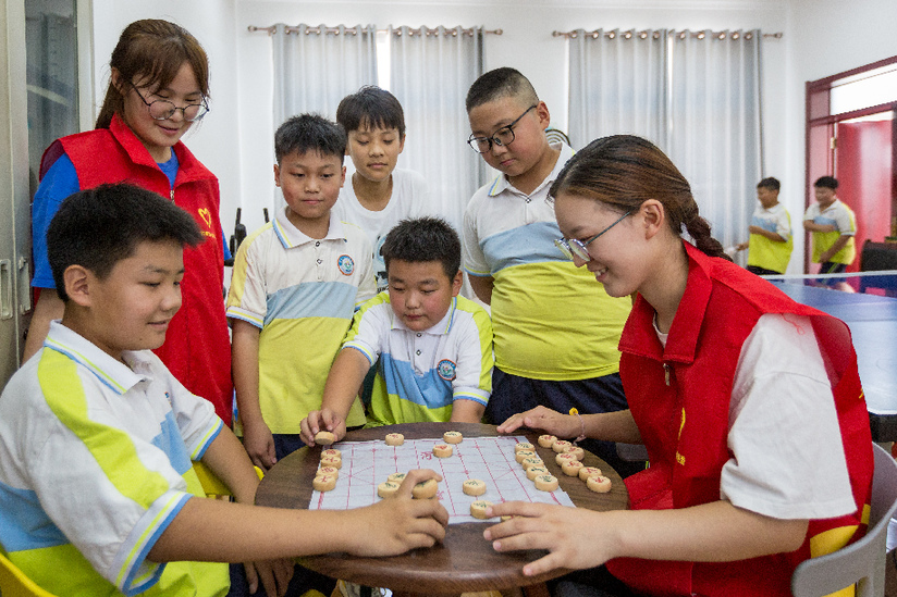 8月2日,河南省安陽(yáng)市安陽(yáng)縣韓陵鎮新時(shí)代文明實(shí)踐所,韓陵鎮東梁貢小學(xué)四年級學(xué)生王立恒(左一)與文藝志愿者進(jìn)行中國象棋比賽。新華網(wǎng)發(fā)(王建安 攝)