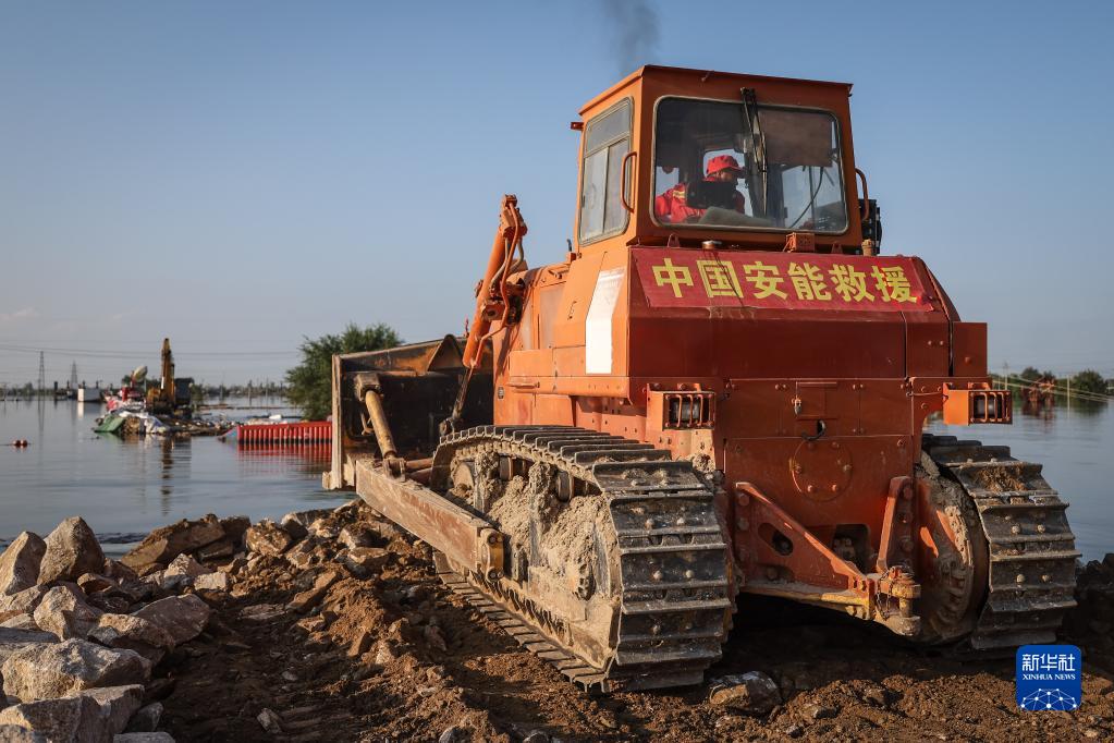8月5日,中國安能集團搶險人員在潰口處駕駛推土機進(jìn)行封堵作業(yè)。