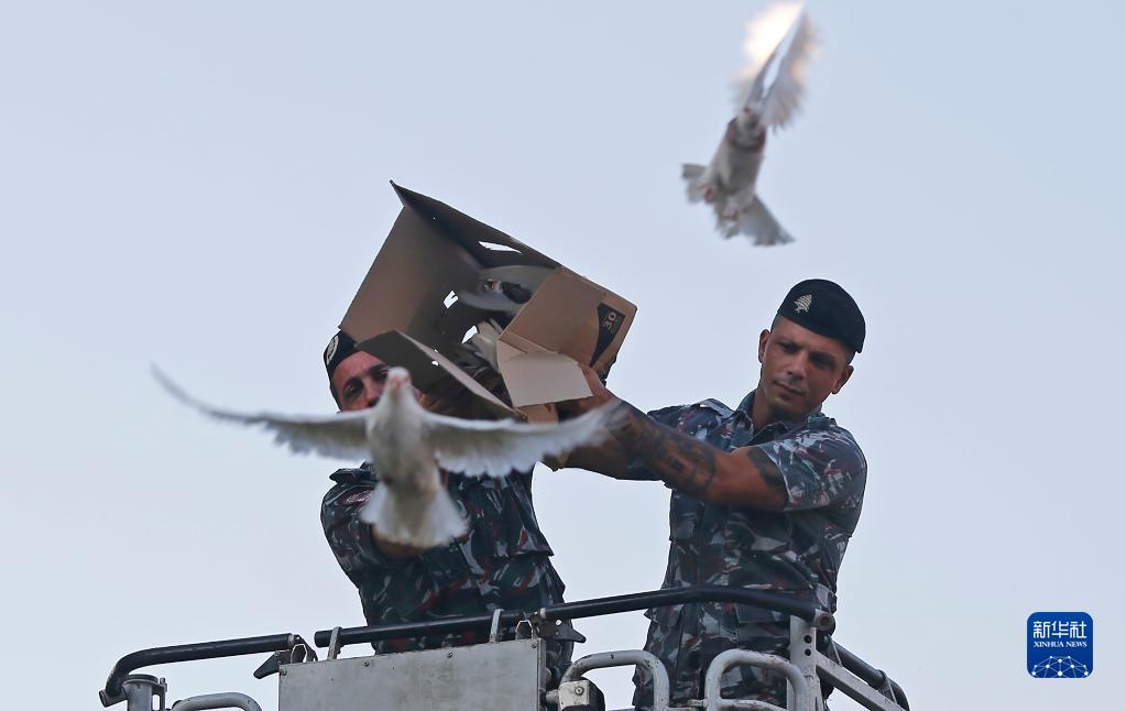 8月3日,在黎巴嫩貝魯特,人們放飛白鴿,紀念貝魯特港口大爆炸中犧牲的消防人員。