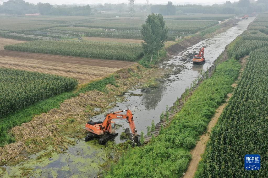 8月6日,工人在昌黎縣新集鎮境內的引灤河水灌渠清淤現場(chǎng)施工(無(wú)人機照片)。