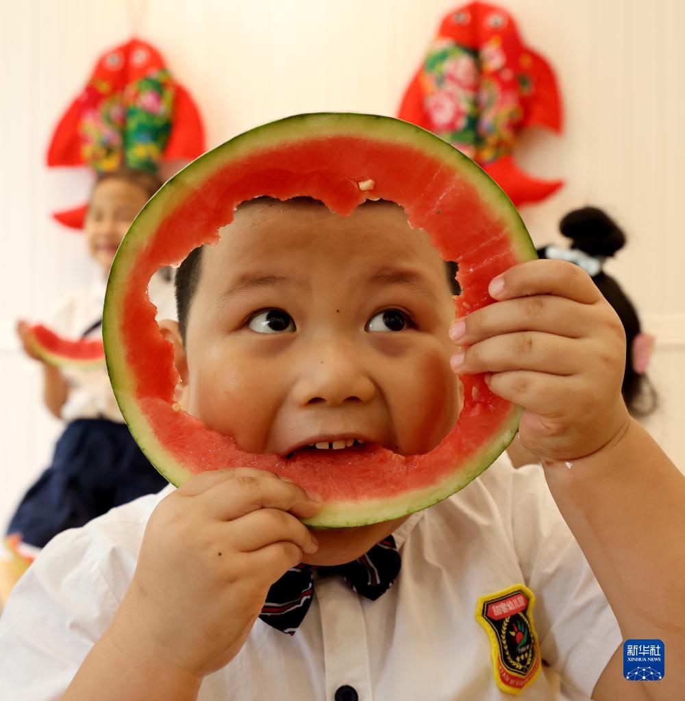8月6日,山東省棗莊市龍山路街道一家幼兒園小朋友在吃西瓜“啃秋”。
