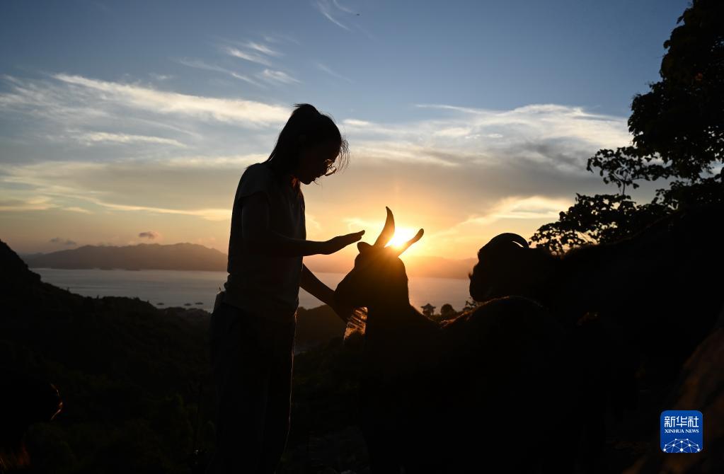 8月5日在福鼎市崳山島拍攝的夕陽(yáng)下的汪淇和她的羊群。