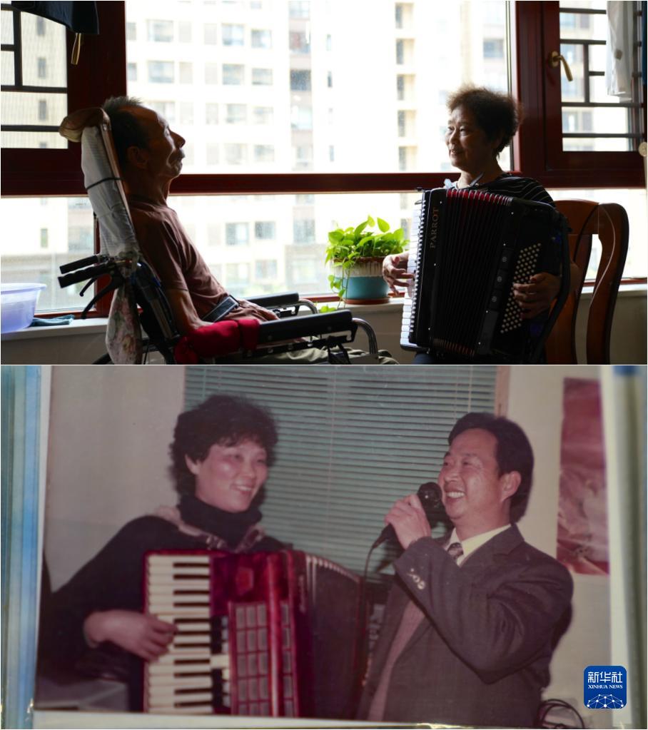 拼版圖片:上圖為2022年8月2日,許再霞(上右)在家中演奏手風(fēng)琴樂(lè )曲;下圖為1987年拍攝的拉著(zhù)手風(fēng)琴的許再霞與丈夫。