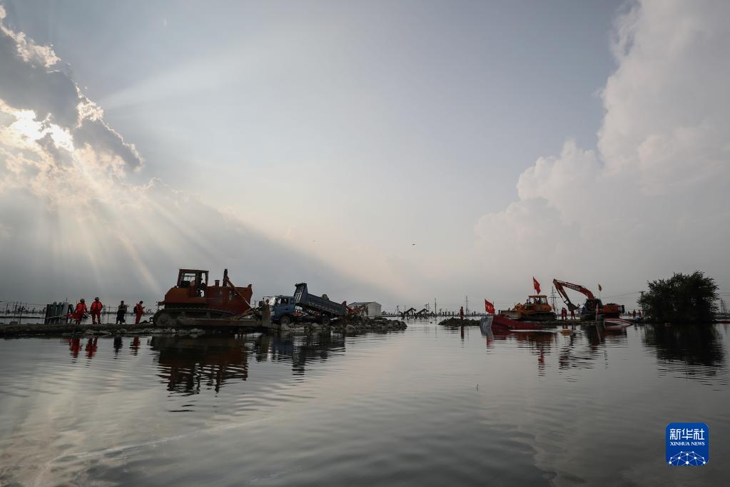 8月6日,搶險人員在潰口處進(jìn)行封堵作業(yè)。