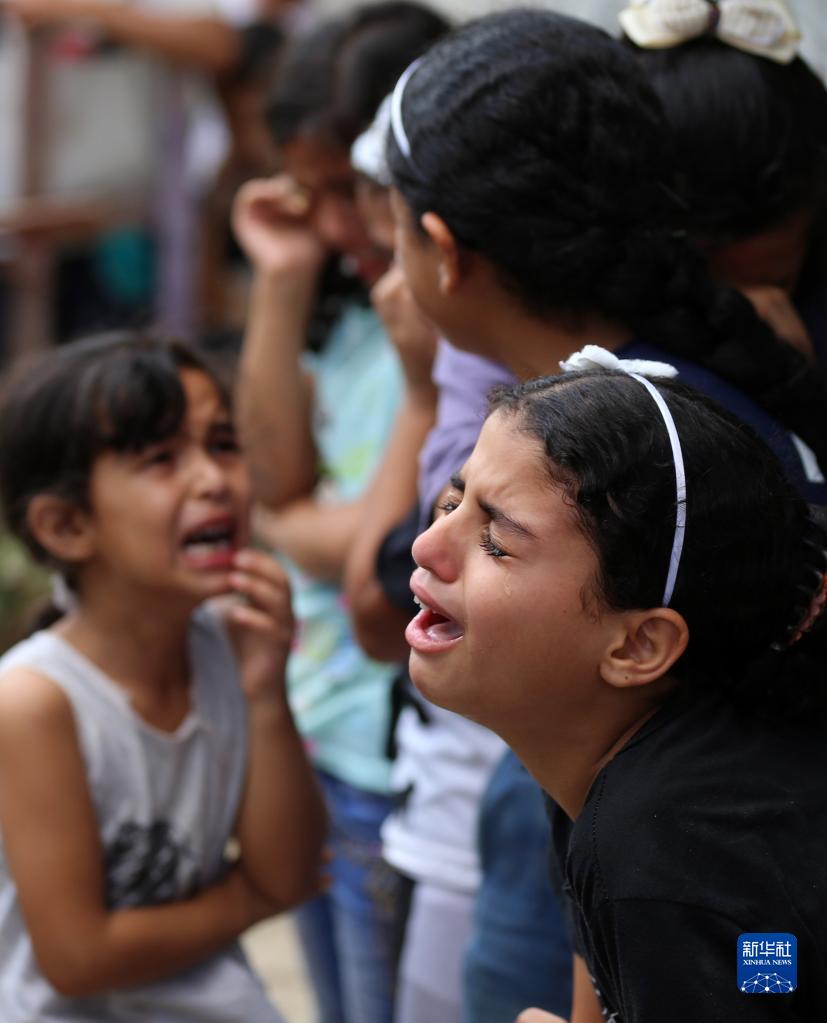 8月6日,在加沙地帶南部城鎮汗尤尼斯,孩子們在空襲遇難者的葬禮上哭泣。