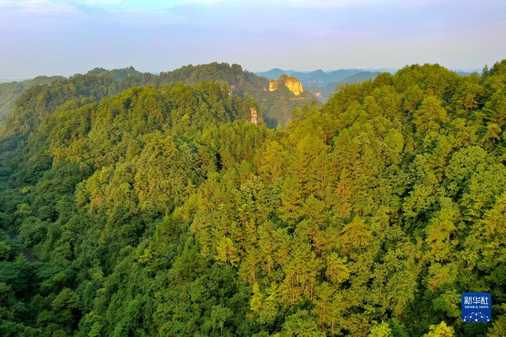 8月7日,朝陽(yáng)照在云臺山山林間(無(wú)人機照片)。
