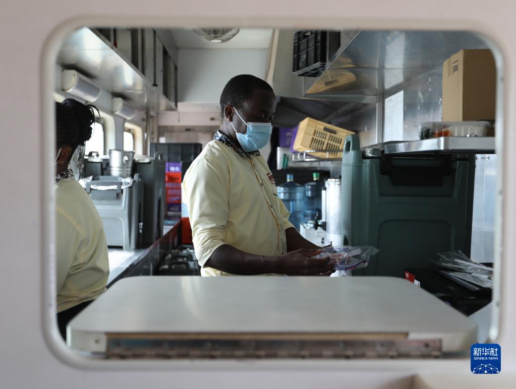 7月29日,餐車(chē)員馬克在肯尼亞蒙內鐵路客運列車(chē)的餐車(chē)工作。