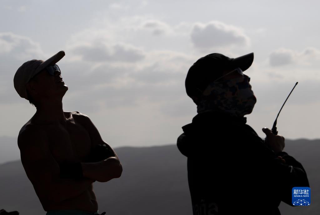 在新疆烏魯木齊市南郊山間,陳瑞峰(左)和同伴在地面觀(guān)察其他傘友的飛行訓練(5月29日攝)。新華社記者 胡虎虎 攝