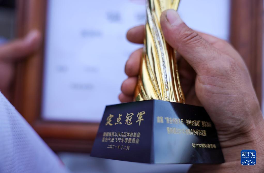 這是陳瑞峰在2021年12月參與冰雪節慶活動(dòng)滑翔傘交流賽時(shí)所獲的獎杯(6月14日攝)。新華社記者 胡虎虎 攝