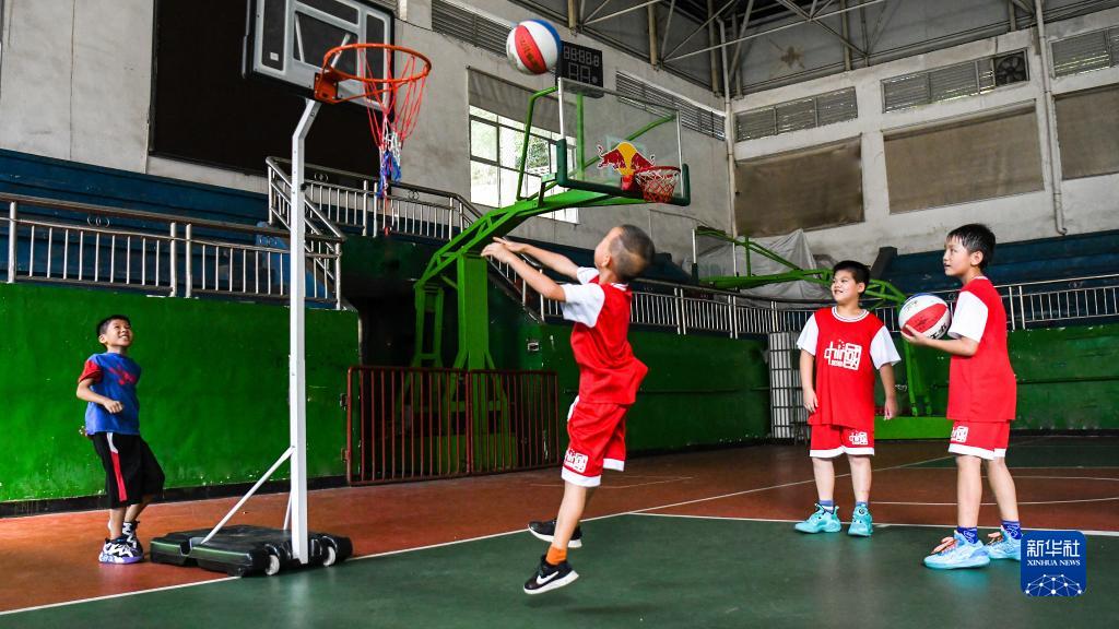 8月8日,孩子們在湖南省常寧市泉峰公園籃球場(chǎng)打籃球。