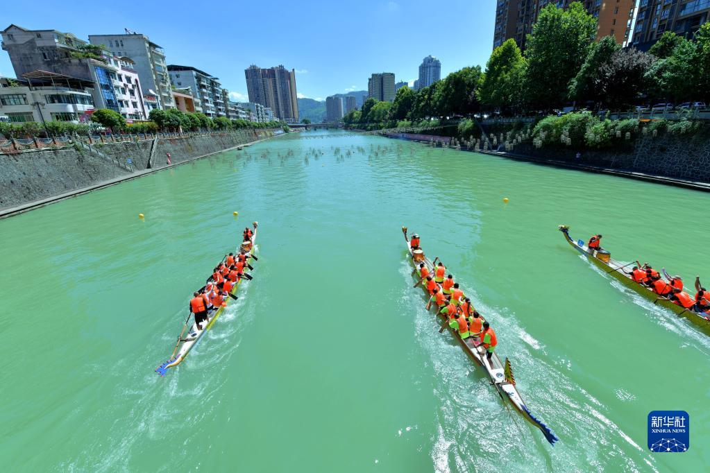 8月8日,市民在湖北省宣恩縣仙山貢水旅游區的貢水河上參加劃龍舟比賽。