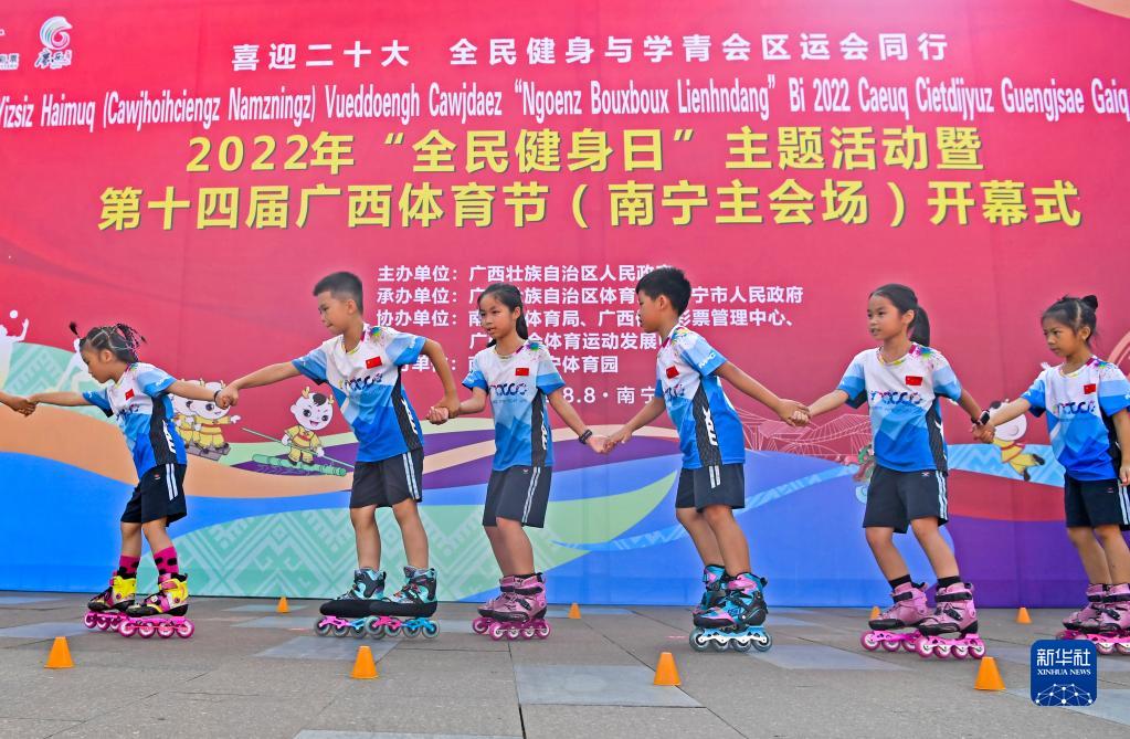 8月8日,全民健身項目展演人員在第十四屆廣西體育節開(kāi)幕式上表演輪滑。