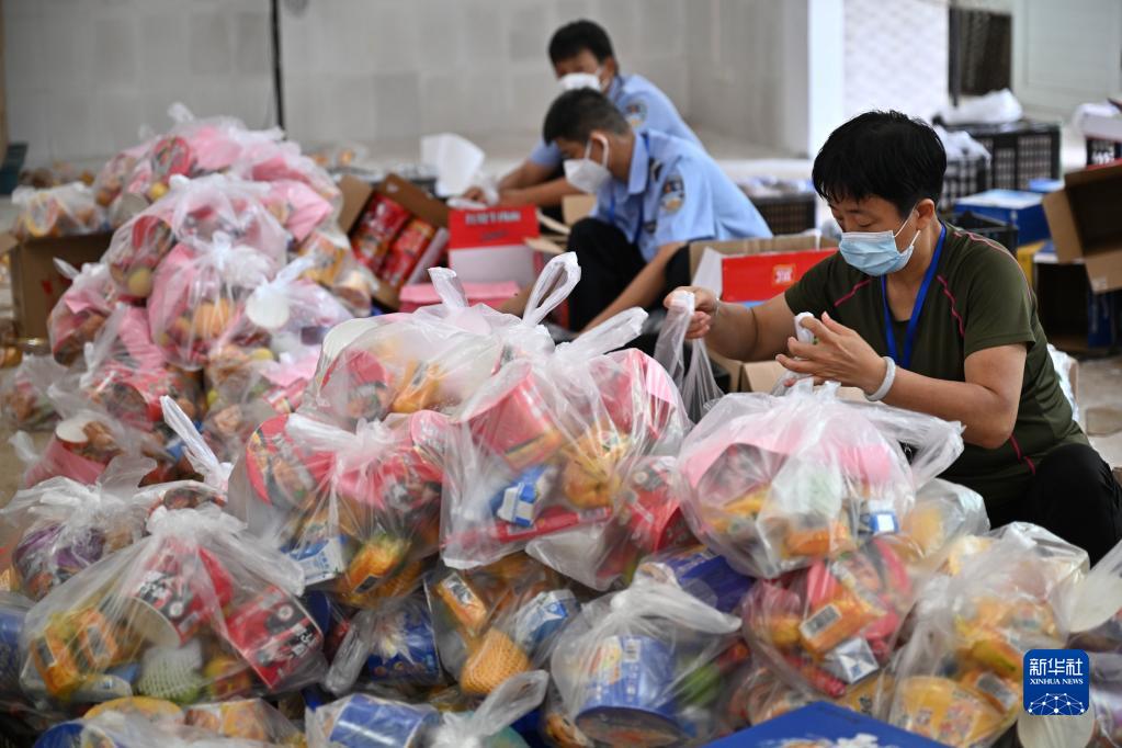 8月8日,在三亞一個(gè)物資倉庫,來(lái)自三亞各單位的工作人員將政府籌集的生活物資打包,準備送往游客入住的酒店。