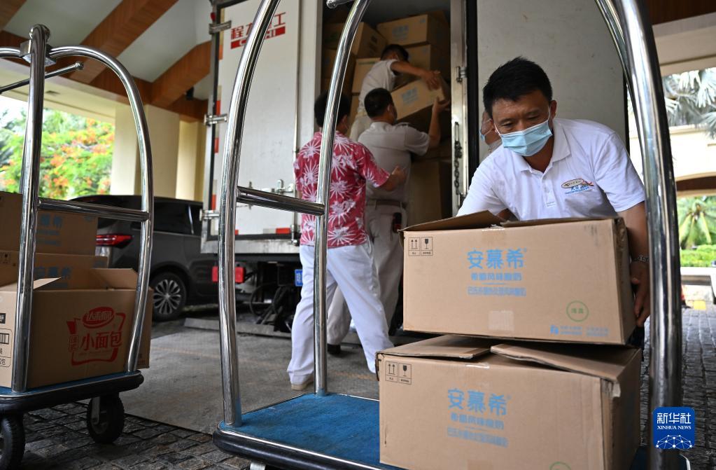 8月8日,三亞亞龍灣一家酒店的工作人員搬運生活物資。