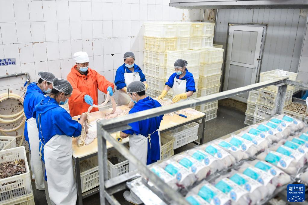 崔玉梅(左三)在加工車(chē)間內檢查精修牛副產(chǎn)品的質(zhì)量(8月4日攝)。