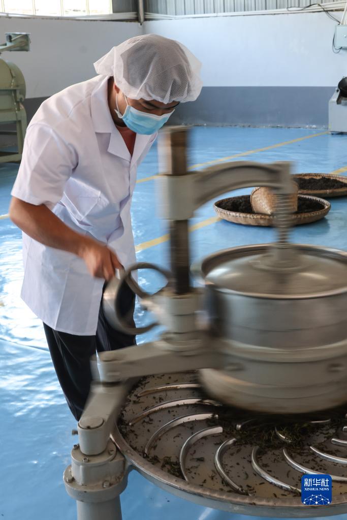 8月9日,工作人員在石阡縣楓香鄉梨子園村茶葉加工廠(chǎng)內對茶青進(jìn)行揉捻。