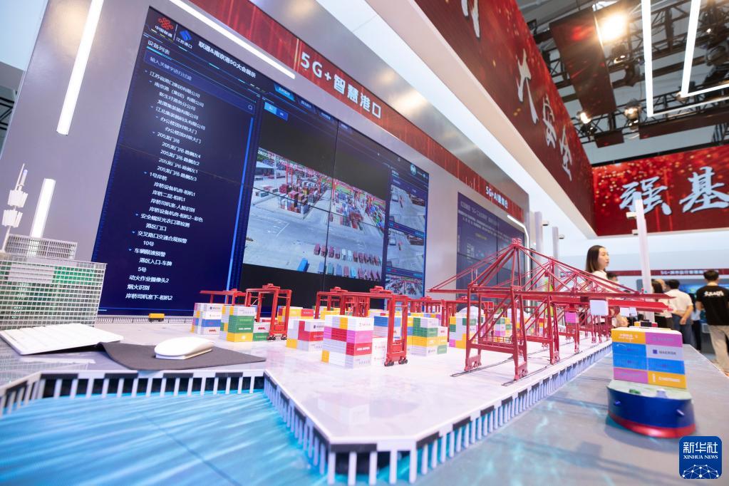 8月9日在中國聯(lián)合網(wǎng)絡(luò )通信集團有限公司展區拍攝的5G+智慧港口。