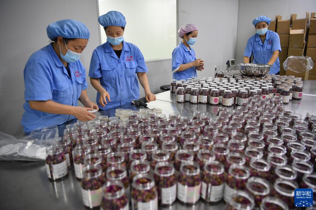 8月9日,陜西省漢陰縣一家食品加工企業(yè)的工人在包裝玫瑰花茶。