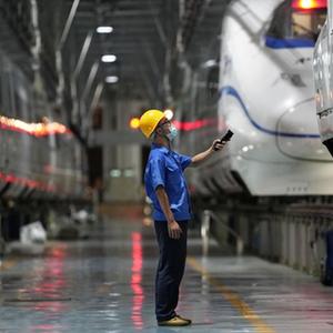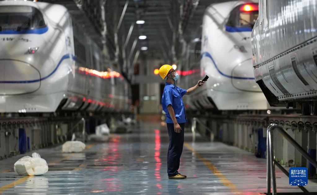 8月9日,在中國鐵路上海局集團有限公司南京動(dòng)車(chē)所內,南京電務(wù)段動(dòng)車(chē)車(chē)載設備車(chē)間工作人員確認待檢動(dòng)車(chē)車(chē)號。