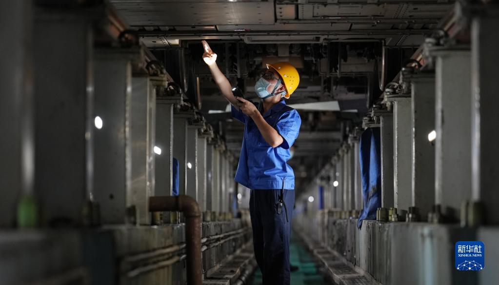 8月9日,在中國鐵路上海局集團有限公司南京動(dòng)車(chē)所內,南京電務(wù)段動(dòng)車(chē)車(chē)載設備車(chē)間工作人員檢查動(dòng)車(chē)車(chē)底天線(xiàn)安裝狀態(tài)。