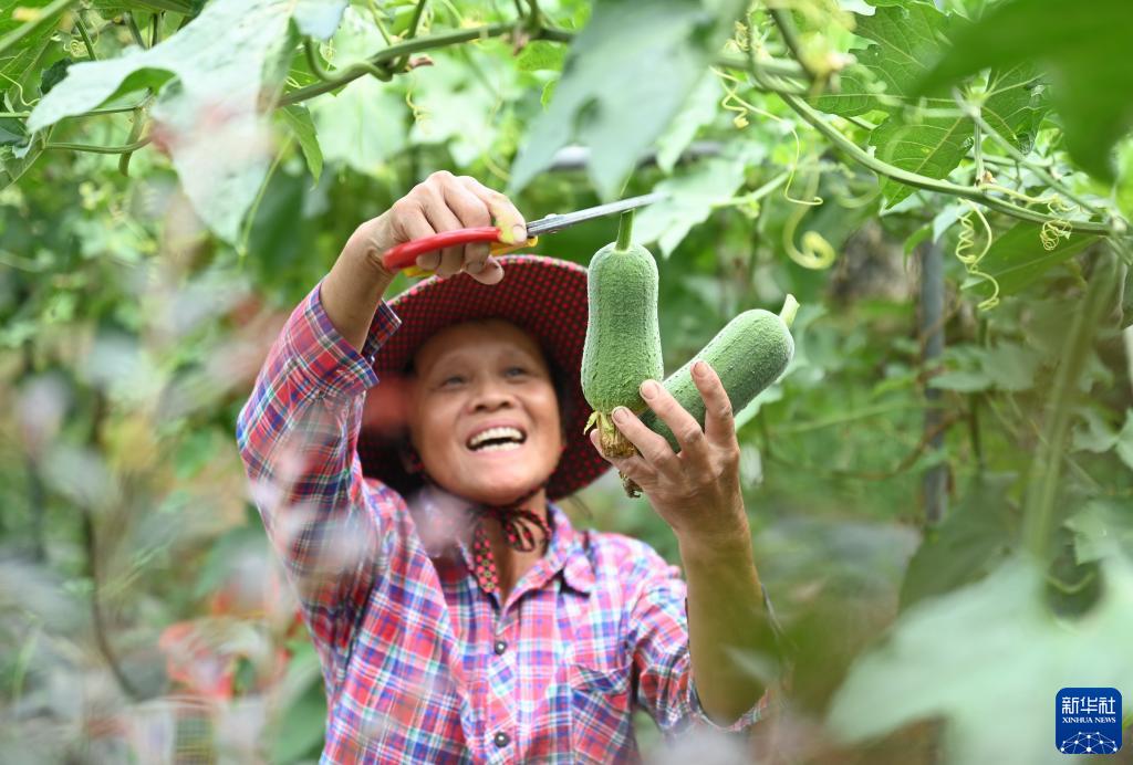 8月9日,村民在建甌市迪口鎮可建村富民農業(yè)生態(tài)觀(guān)光園采摘絲瓜新品種。